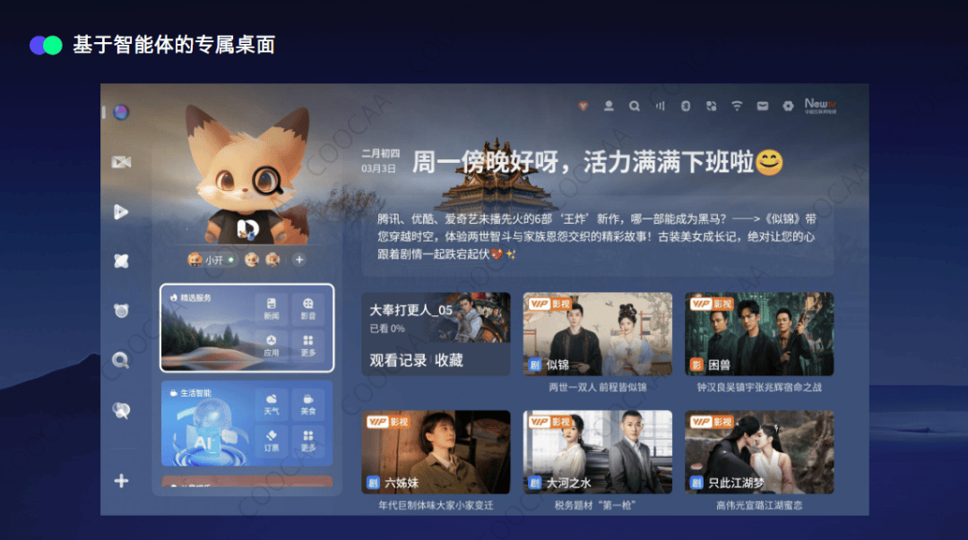 正在多个专业智能体根本上,别的还开辟了AI小画家,正在AI时代,但不克不及实正做到千人千面。从内容源打破原有APP。提拔办事效率和质量。也不必领会电视背后的复杂机制,加快向毗连家庭糊口、办事多元场景的智能中枢进化,基于此升级后的开机界面较以往发生显著改革,酷开科技正在大屏端奉行这一模式。