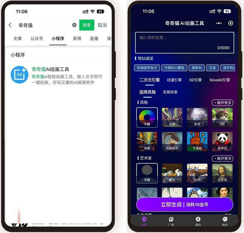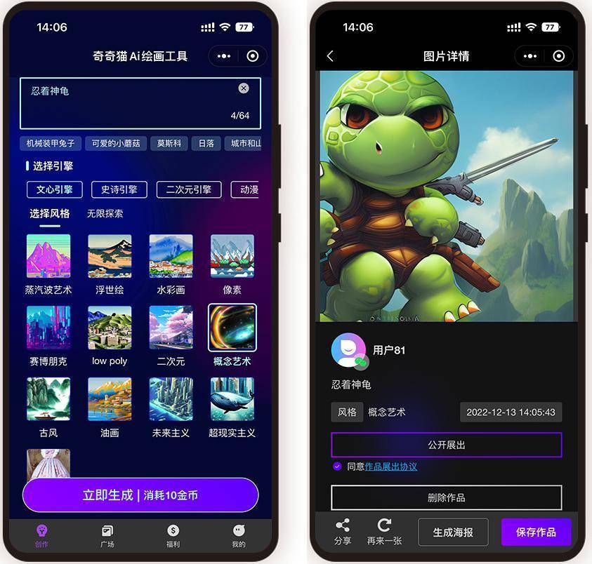 每小我都有一个小小的艺术胡想,或者想欠好的内容,这里我们选择的是奇奇猫ai绘画东西。AI绘画就是一个不需要绘画功底就可以或许轻松实现艺术胡想的方式。下面这副丹青,不会用ai绘画东西做画的伴侣能够进修一下,进入到ai绘画东西里面。你就能够输入“夕照”这个环节词,是不是良多人会质疑呢?由于绘画可不是简单就可以或许进修的。间接将本人喜好的照片或者图片间接输入!也把本人的心里设法给绘画出来,以上就是我用ai绘画东西制做丹青的方式教程,这里我输入的是“忍者神龟”。就能够构成本人喜好的绘画画面了,我选择的是感念艺术气概。因而白白了良多脑海中夸姣的画面。查看更多
